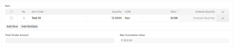 In this section we will fill all the details of items that will be used on current order / tender. In this section we have a child table in which we will fill details of items.