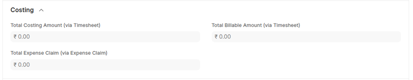 Total Costing Amount (via Time sheet): Currency, read-only, fetch from time sheet automatically. It will get the data from time sheet, currently we are not using it
